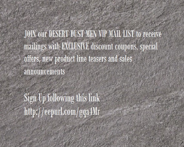 JOIN our DESERT DUST MEN MAIL LIST to receive mailings with EXCLUSIVE discount coupons and sales announcements